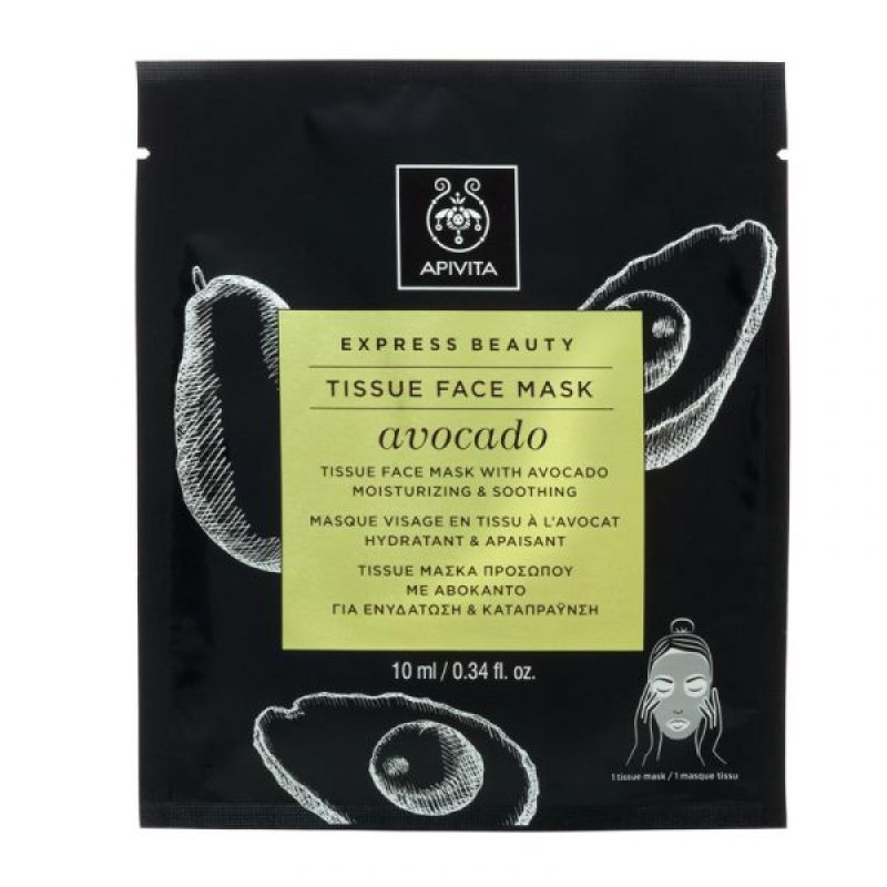 Ημιδιάφανη υφασμάτινη biocellulose μάσκα προσώπου, εμποτισμένη με έναν ορό ενισχυμένο με αβοκάντο, ένα φρούτο που ευδοκιμεί στη Μεσόγειο και είναι γνωστό για την προστατευτική του δράση στην υγεία της καρδιάς, και ενυδατώνει σε βάθος την επιδερμίδα. 100% βιοαποικοδομίσιμη.